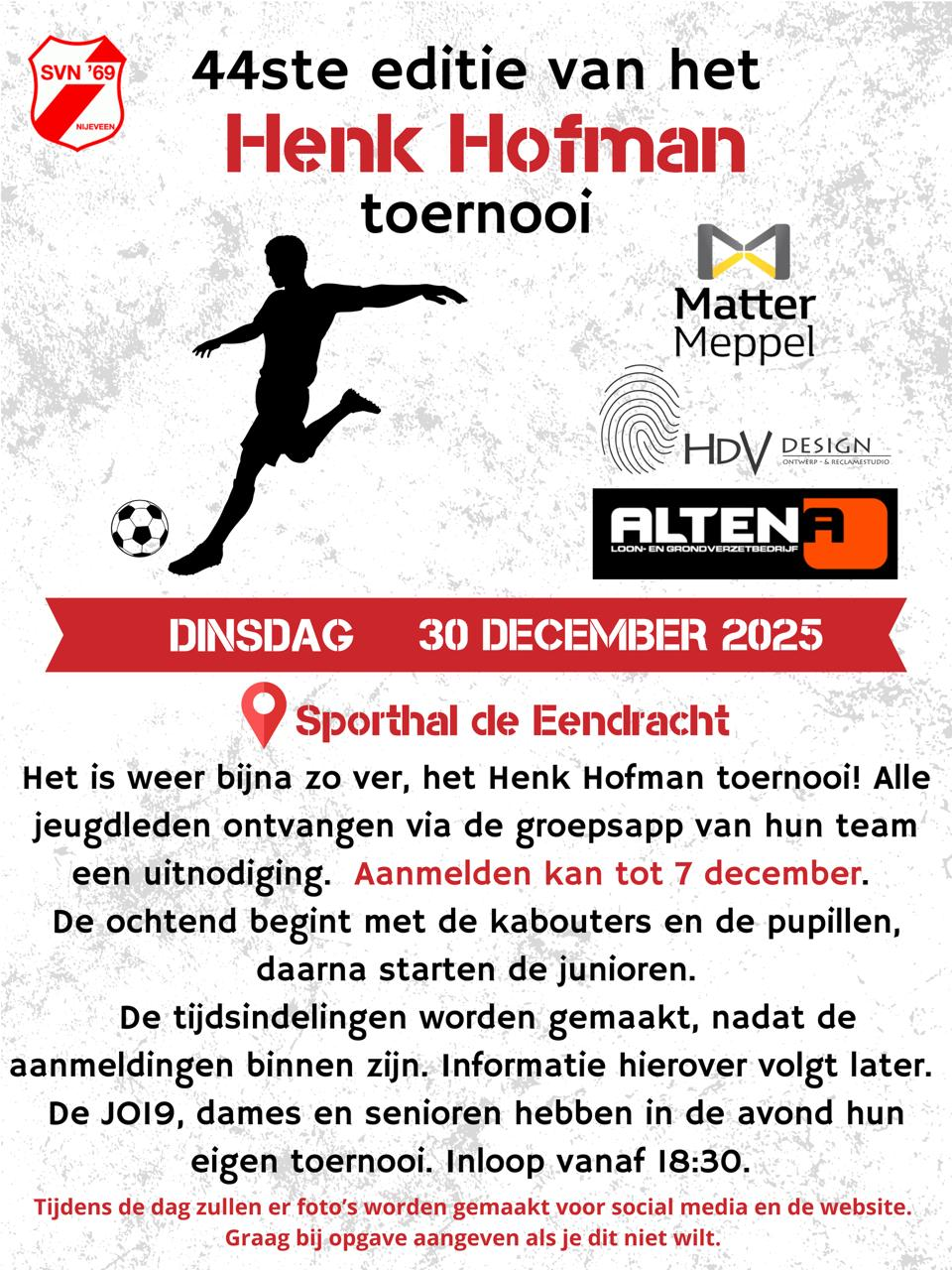 Op dinsdag 30 december staat ons jaarlijkse Henk Hofman toernooi weer op het programma. Een mooie traditie waarbij sportiviteit, plezier en teamgevoel centraal staan. Overdag zijn er wedstrijden voor alle jeugdleden tot en met JO17 (opgave tot 7 december via eigen team/leider). En ’s avonds is er een toernooi voor de senioren vanaf JO19.